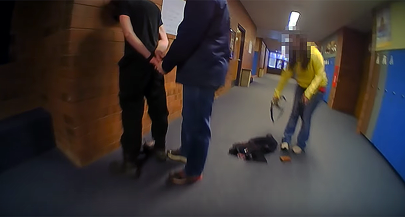 The officer is seen running down the hall and once he reaches the boy, viewers can see that he's standing facing the wall with his hands being held behind his back. Two firearms are visible on the floor, a shotgun and a handgun. The officer pats down the student and asks "is it just you?" His response is redacted but the officer later is overheard saying "just one, just one" and tells the radio there is a "single 1082."