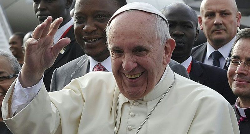 Pope Francis (R), followed by Kenya's President Uhuru Kenyatta, waves as he arrives at the international airport in Nairobi on November 25, 2015 (AFP)