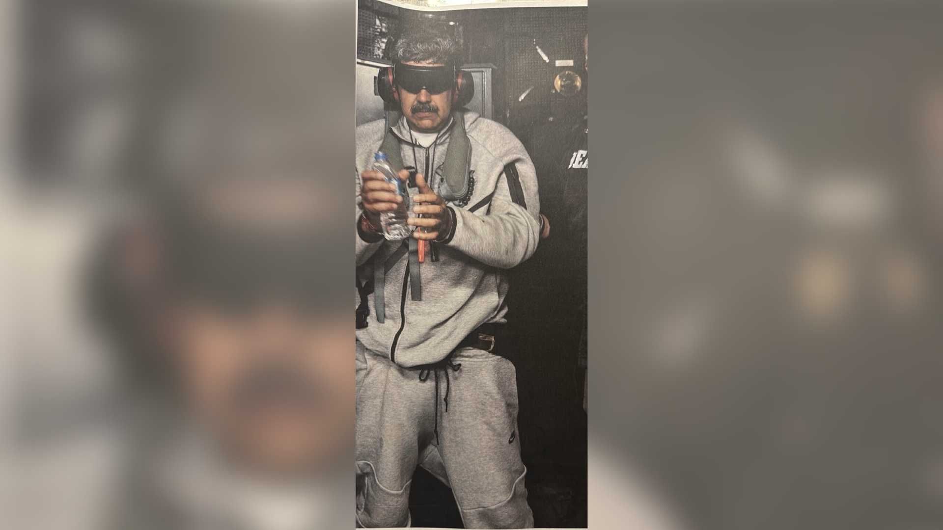 In the photograph, Maduro can be seen wearing grey sweatpants and a sweater wearing dark glasses, possibly to obscure his vision as he's transported to New York to face trial on drug trafficking charges. He's also seen clutching a water bottle.
