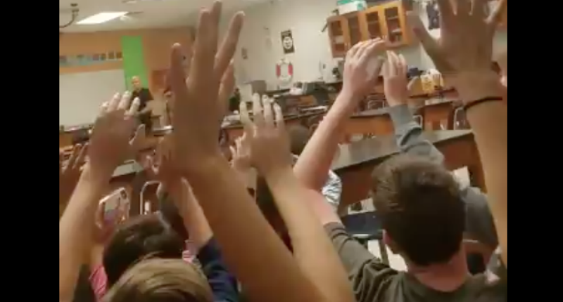 Students inside a classroom at Marjory Stoneman Douglas high school raise their hands as a SWAT team prepares to evacuate them. Image via screengrab/Twitter.
