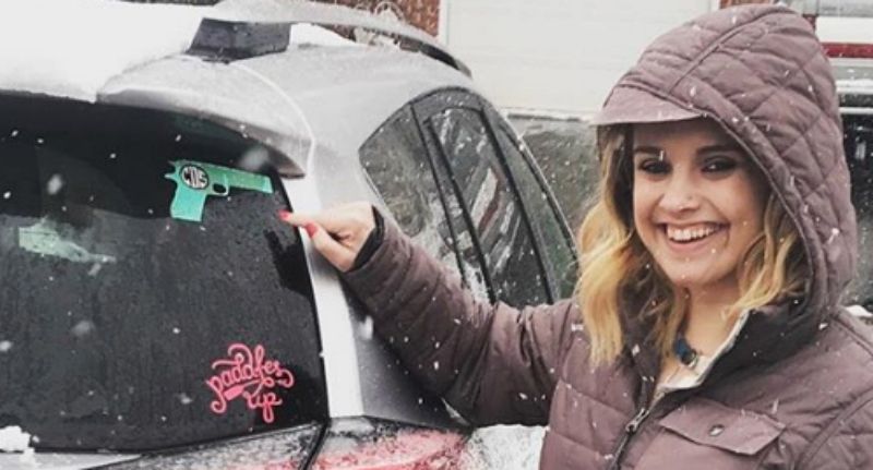 Chelsea "Storm" Durham poses next to a gun sticker on her car. Image via Durham's Instagram.