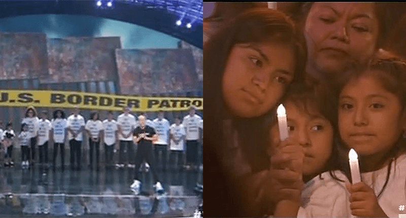 Behind the kids on stage was a long yellow police tape on the screen reading "U.S. Border Patrol." At the end of the song, the curtain behind them went up and their parents came out to stand with their children.