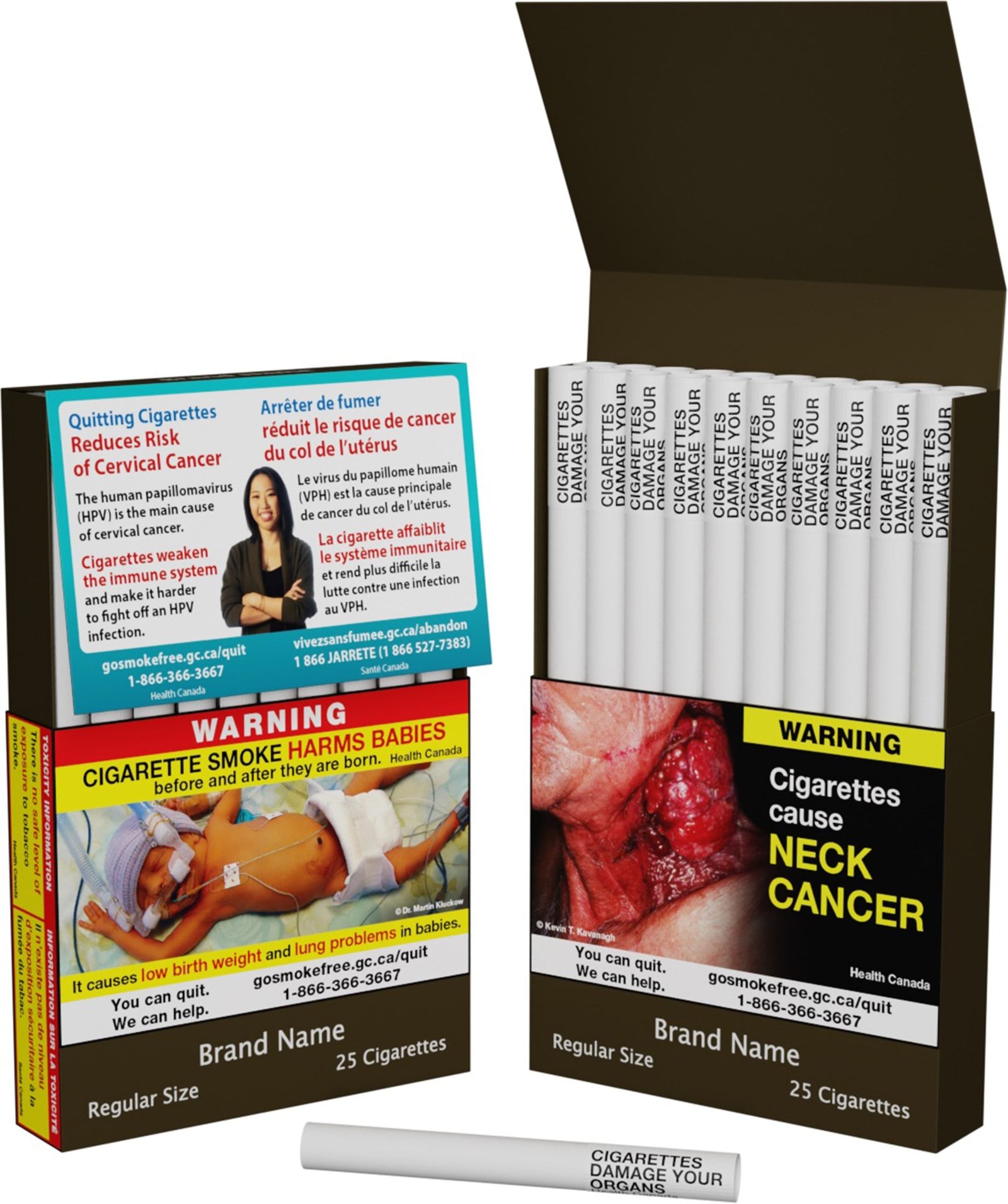 This image, provided by Health Canada, shows warnings that will be printed on individual cigarettes. - Health Canada/TNS