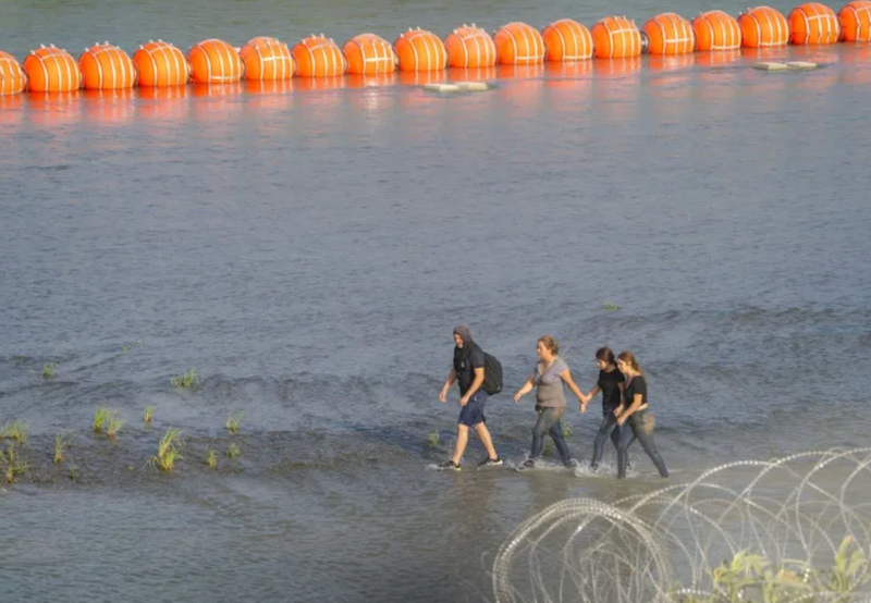 Migrants walk between razor wire and a string of buoys placed on the the Rio Grande border with Mexico in Eagle Pass, Texas