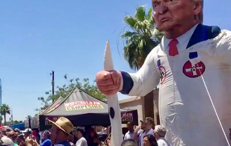 Protestors were ready, greeting the First Lady in a mass of people with signs and a massive inflatable float of the president wearing a Ku Klux Klan robe and holing a white hood, Phoenix New Times reports.