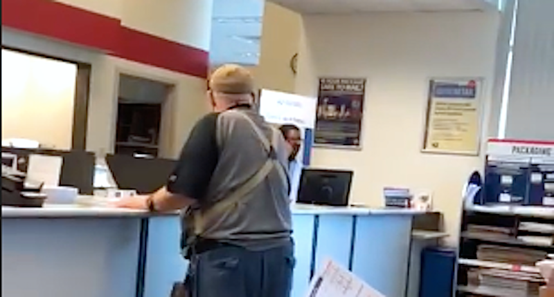 The incident was captured on cell phone video and uploaded to Facebook, where the man can be seen arguing with other customers and then turning his anger back on the postal worker.