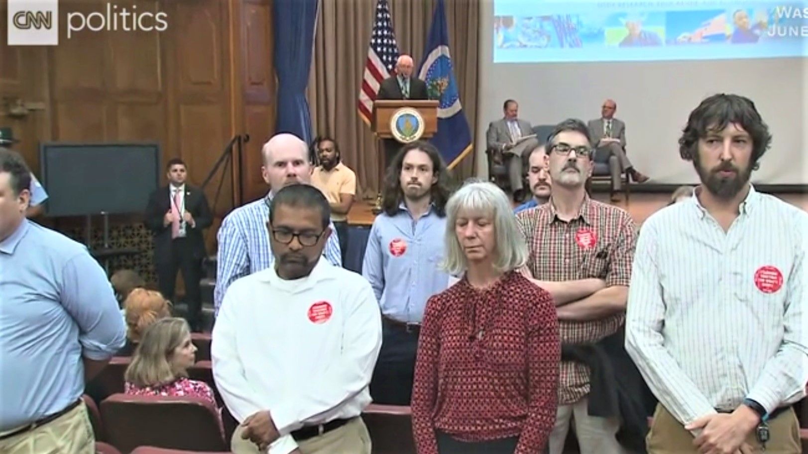Department of Agriculture employees turn their backs on Agriculture Secretary Sonny Perdue (Screen cap).