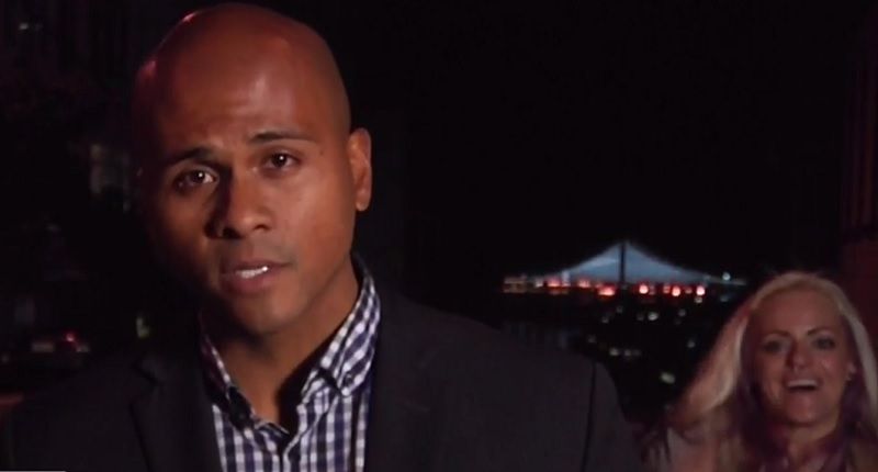 Pete Suratos of San Francisco's KNTV was in the field reporting on a $353,000-per-couple fundraiser held by actor George Clooney when a blonde woman sneaks up behind him and lifts her shirt. The grinning flasher then ran away.