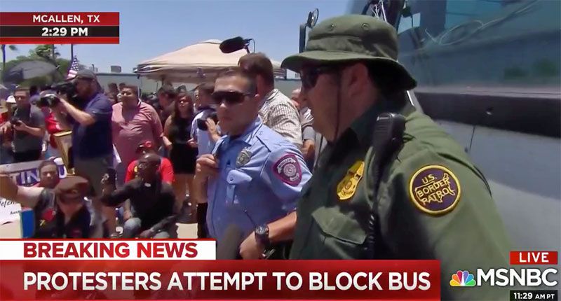 Protesters are blocking a Border Patrol detention bus at the Central Processing Station in McAllen, Texas.