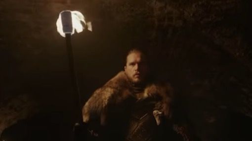 The scene takes place in the crypts below Winterfell, where we hear the voices of the late Ned and Catelyn Stark speak of Jon as he passes their statues.