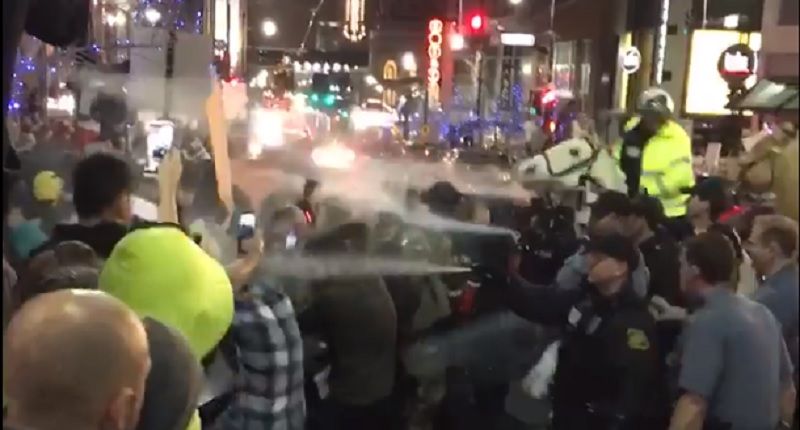 Police were caught on video using pepper spray on demonstrators outside a Donald Trump rally in Kansas City on Saturday.