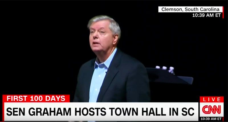 South Carolina Sen. Lindsey Graham (R) got a rude -- but maybe not unexpected reception at a town hall in Clemson -- telling attendees he is trying to work with President Donald Trump.