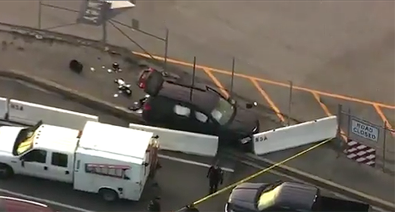 A black SUV appears to have crashed into white security barriers outside of the National Security Administration in Fort Meade, Maryland. Shots were fired, according to local media and there are bullet holes in the vehicle, including in the front window.