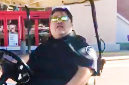 A mall security officer berates a woman outside a Target in San Diego (Screen cap).