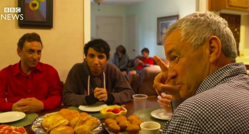 Steve Weller (right) meets with Muslim refugees -- (BBC YouTube screenshot)