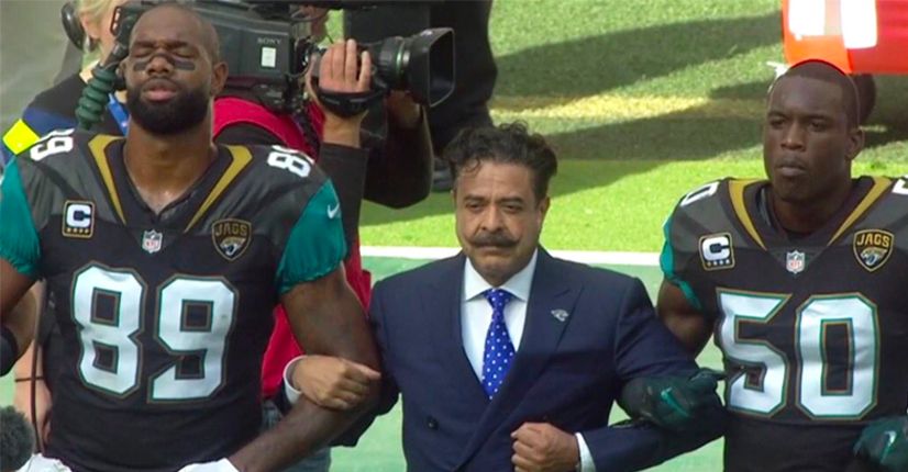 In photos posted to Twitter, Jaguars owner Shahid Khan was also seen locking arms on the sideline with players.