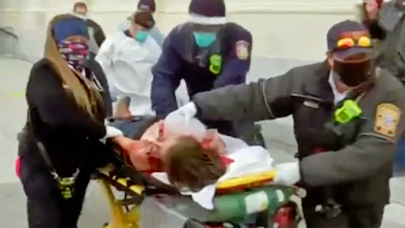 "Oh, my gosh," she said. "Oh my gosh. "Guys, I have to interrupt," she continued. "On the right-hand side of the screen, paramedics bringing out a stretcher, it looked like a woman, very gravely injured, covered in blood."