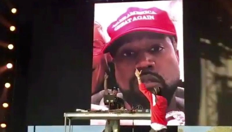 Hustle performed "F*ck Donald Trump" with Kanye's Make America Great Again hat selfie behind him. At one point he turned with his middle finger extended to West and his friends.