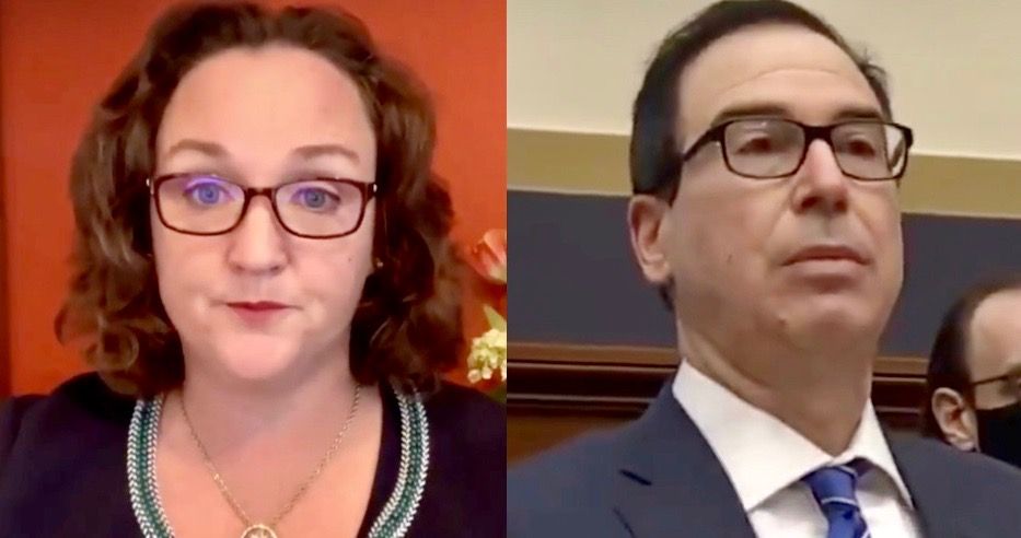 Porter began by telling the Treasury Secretary, "I'm reading aloud now from Section 4027 of the Cares Act. 'On or after January 2026 any funds that are remaining shall be transferred to the general fund." In other words, set, sent back to the Treasury. Secretary Mnuchin, is it currently the year 2026, yes or no?"