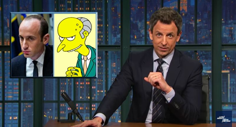 It didn't take long for amazingly intense Trump adviser Stephen Miller to become fodder for late night comics, with Seth Meyers comparing him to the conniving and evil Mr. Burns from "The Simpsons."