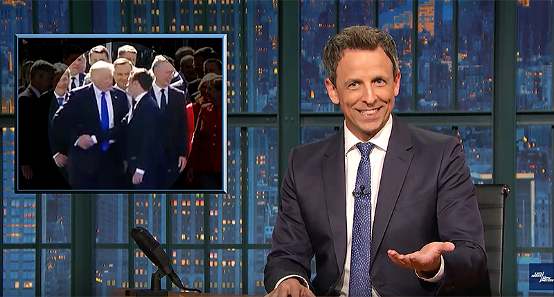 When he encountered newly elected French President Emmanuel Macron, Trump had a hard time letting go. Meyers suggested that it was probably because Trump was so grateful someone would take his hand after his wife kept slapping it away.