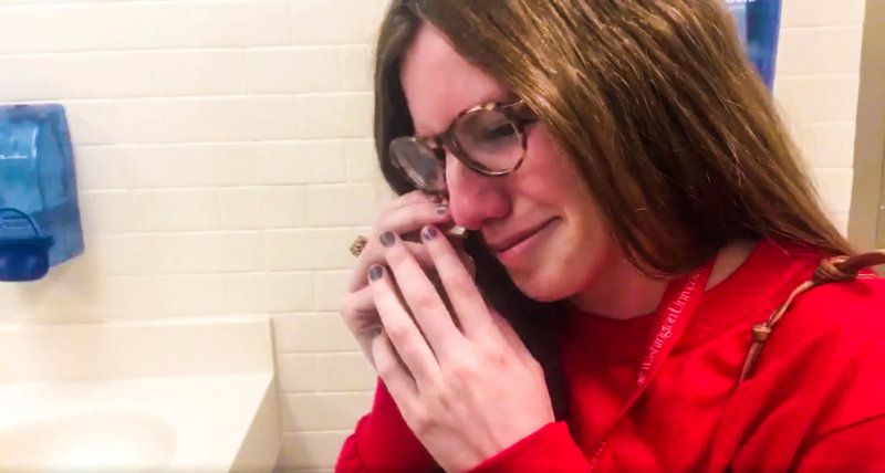 Per Death and Taxes, reporter Christine Dubill on Sunday night went into the women's room and found a young woman crying inside. She asked if the woman would like to talk about why she was upset on camera, and she consented.