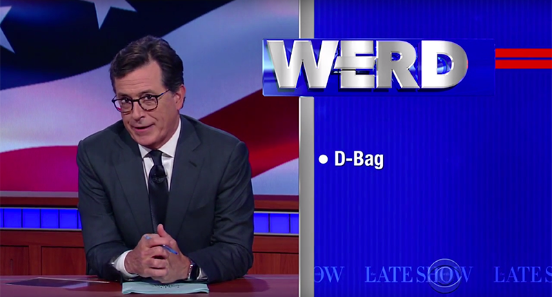 The screen next to Colbert simply read: “D-Bag.”