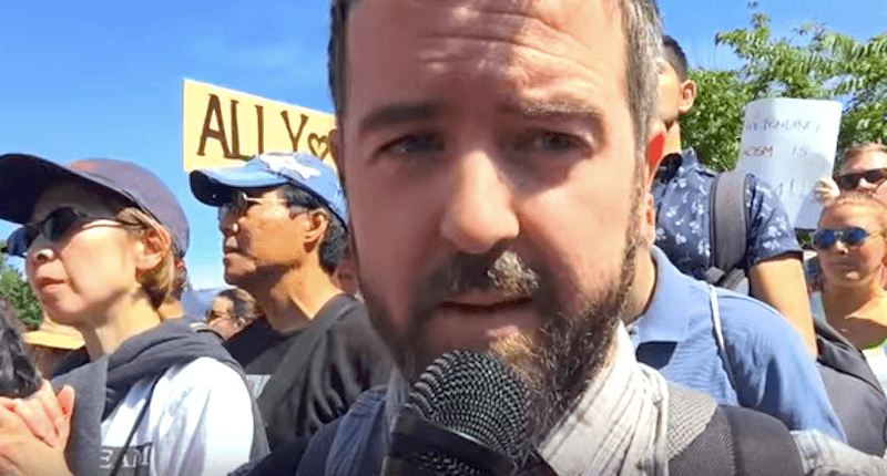 A contrarian filmmaker complained he was the victim of leftist violence Saturday afternoon when he was bopped on the head by a beach ball at an anti-racism demonstration in Vancouver.
