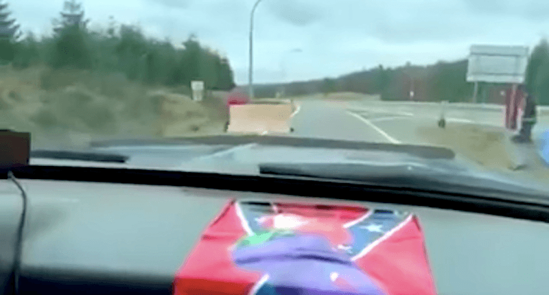 The video shows a pickup truck with a Confederate flag draped across the dashboard driving the wrong direction on an off-ramp on a Courtenay, British Columbia, highway toward protesters taking down a blockade, reported Global News.