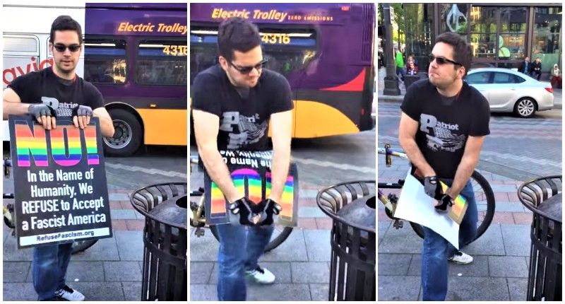 A member of Patriot Prayer, a pro-Trump organization that regularly organizes "free speech" rallies in the president's name, was caught on camera trying --and hilariously failing -- to rip up an anti-fascism sign.