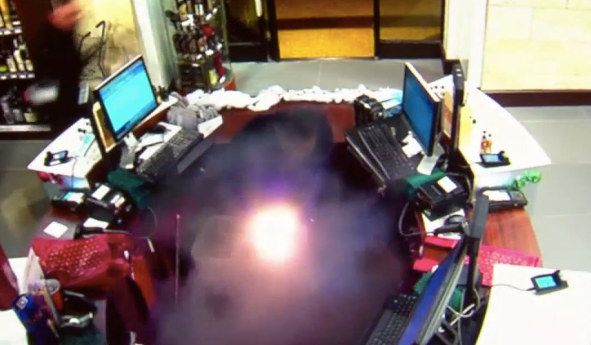 A Manhattan wine shop worker got burned when an e-cigarette in his pocket exploded -- and surveillance cameras caught it all on video.
