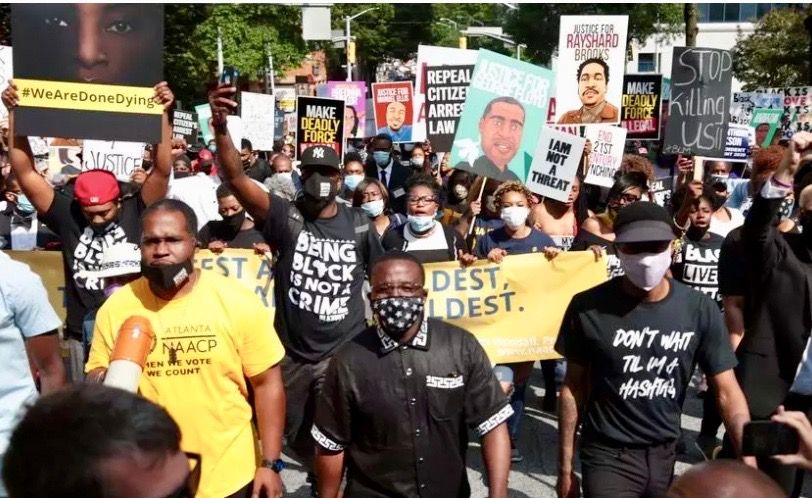 Scores of protesters were out on the streets of Atlanta on Monday morning for a march on the capitol called by the Georgia chapter of the civil rights organization the National Association for the Advancement of Colored People (NAACP).