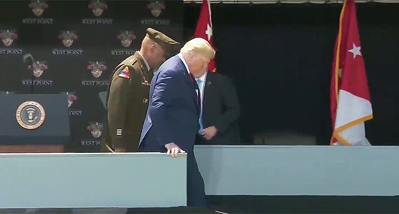 "The ramp that I descended after my West Point Commencement speech was very long & steep, had no handrail and, most importantly, was very slippery," Trump tweeted as speculation grew. "The last thing I was going to do is 'fall' for the Fake News to have fun with. Final ten feet I ran down to level ground. Momentum!"