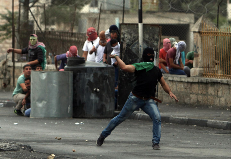 A Palestinian protester throws a stone using a slingshot toward Israeli security guards during clashes at the main entrance of the West Bank town of Bethlehem on October 23, 2015.