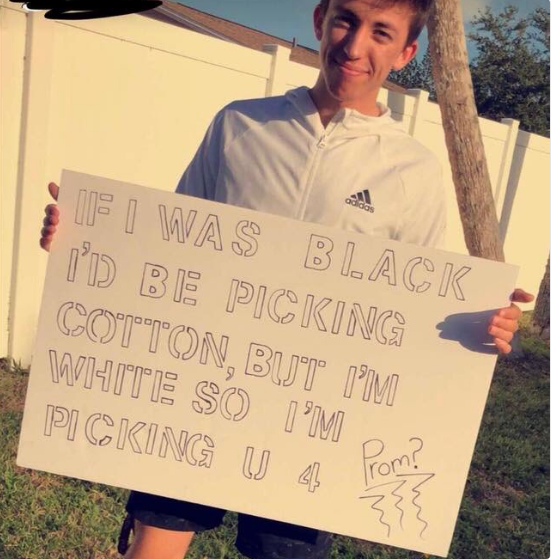 The sign read: “If I was black, I’d be picking cotton, but I’m white, so I’m picking u 4 prom.”