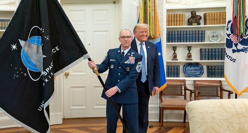 US Space Force CSO GEN Jay Raymond and US Space Force Senior Enlisted Advisor CMSgt Roger Towberman present President Donald J. Trump with the U.S. Space Force Flag Thursday, May 15, 2020, in the Oval Office of the White House. (Official White House Photo by Shealah Craighead)