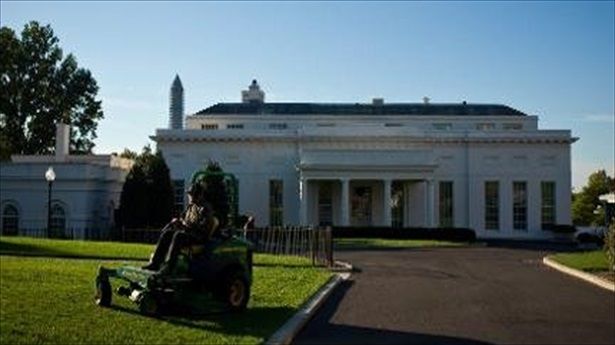 A National Parks Service worker cuts the grass on the North Lawn of the White House with the West Wing seen in the background on Oct. 18, 2013. [AFP]