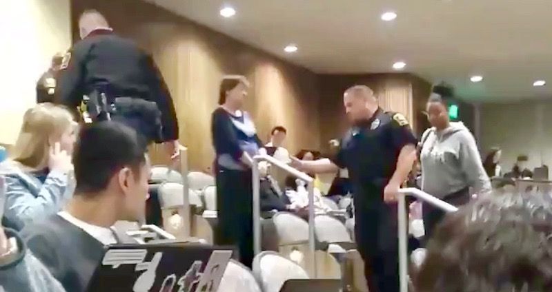 In video shared to Twitter, Biology professor Anita Moss shows two police officers where the student is sitting so that they can escort her out of class.