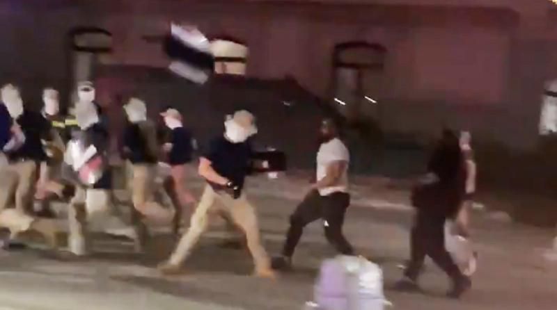 The report states, "They were seen approaching from Market Street before walking in front of City Hall shortly after 11 p.m. Some could be seen holding shields as watchers-on shouted at them, demanding they leave Philadelphia," adding, "A few people could be seen engaging in minor pushing and shoving with members of the group. An NBC10 photographer had his cellphone taken from him by members of the group, before recovering it."