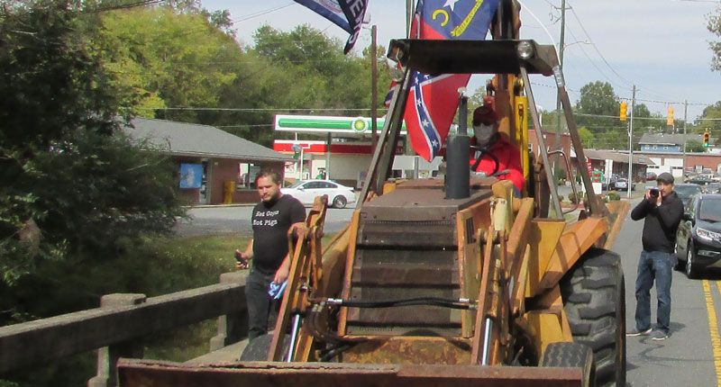 Neo-Confederate activists and antiracists clashed briefly in Pittsboro, NC, a town west of Raleigh, on Saturday, when a man wearing a “Trump 2020” hat and a face mask attempted to drive a front-end loader festooned with Confederate flags down a street where the two groups were facing off.