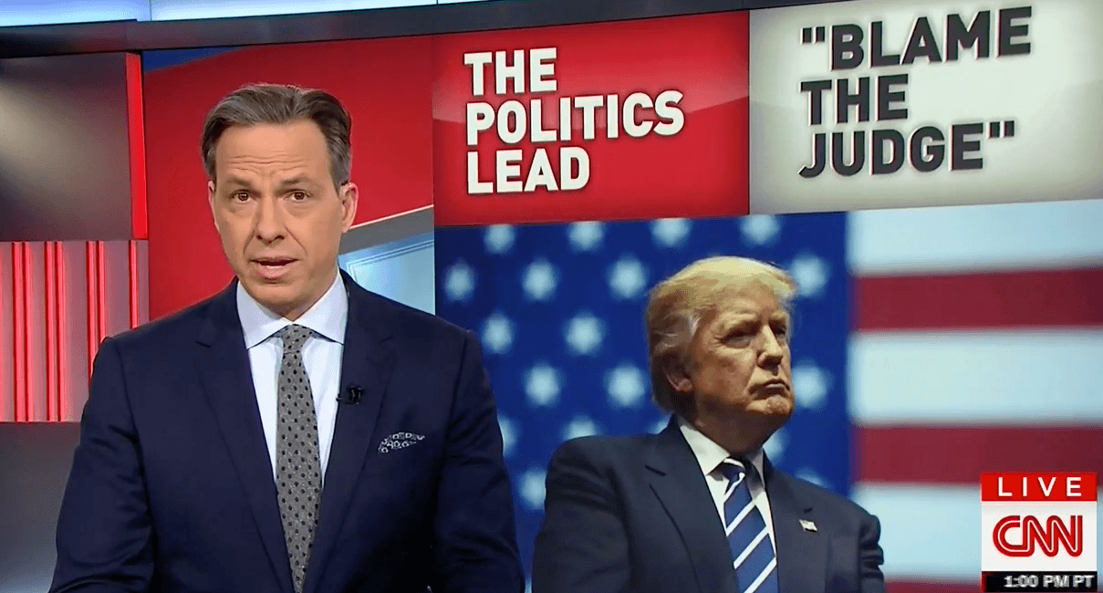 “Mr. Trump went on, ‘Just cannot believe a judge would put our country in such peril,’” Tapper continued, reading the president’s tweets. “If something happens blame him and court system. People pouring in. Bad!”