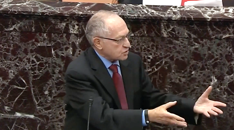 As President Donald Trump’s Senate trial moved on to the question and answer period on Wednesday, attorney Alan Dershowitz — perhaps the most controversial and inflammatory lawyer on the team — began pushing the White House’s arguments to extremes.