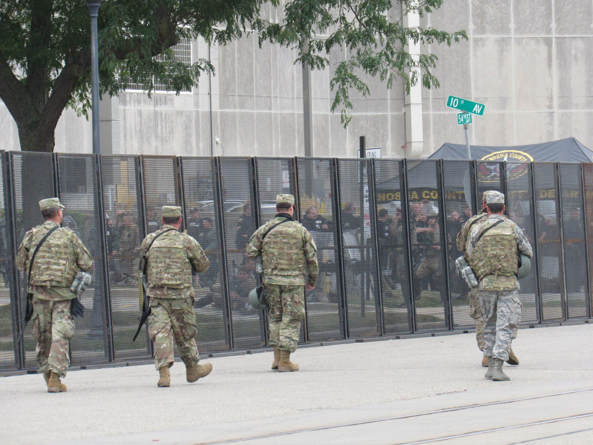 National Guard entering a checkpoint behind which are dozens of soldiers and officers. (Photo | Isiah Holmes)