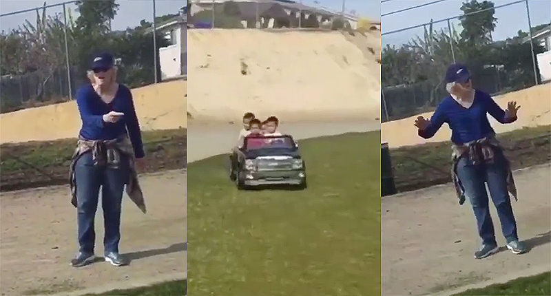 Children were playing in a park area with an electronic toy car when an older woman lashed out at them.