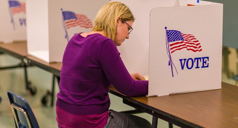 Woman voter at polls during presidential election. (Rob Crandall / Shutterstock.com)