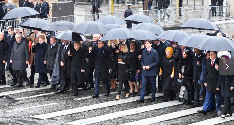 Macron led dozens of heads of state and government including German Chancellor Angela Merkel and Canadian Prime Minister Justin Trudeau, on foot towards a viewing stand at the tomb of the Unknown Soldier under the Arc de Triopmhe.