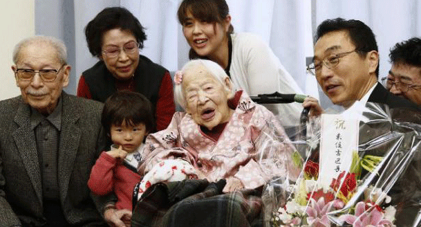 Misao Okawa (C), the world's oldest person, pictured on March 4, 2015 with her family at a nursing home in Osaka (AFP)