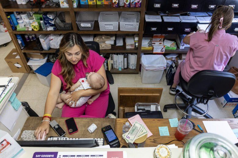 Marla Demita watches her 10-month-old son, Dean Demita, in his playpen at Yazoo City Animal Hospital, Thursday, June 12, 2025, in Yazoo City, Miss.