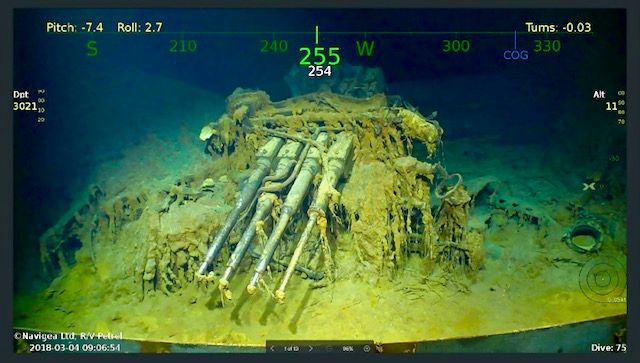The search team also released pictures and video of parts of the ship, including a nameplate, and anti-aircraft guns covered in decades of slime.
