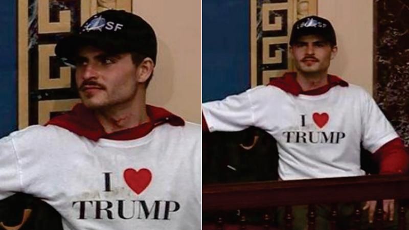 The FBI complaint shows Bacon sitting illegally in the Senate chambers during the riot, wearing an "I Love Trump" T-shirt and a Space Force cap. The FBI alleges that Bacon, while not charged with striking any officers, did play a role in the rioters' violent entry into the Capitol Building: